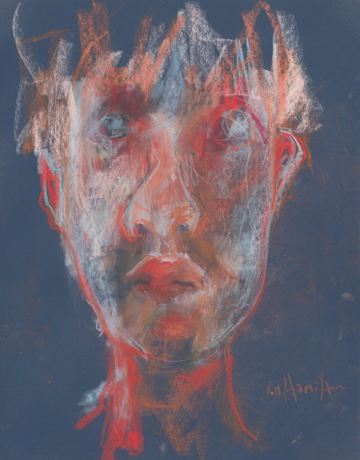 A drawing rendered in charcoal, soft pastels and coloured pencil on textured card.