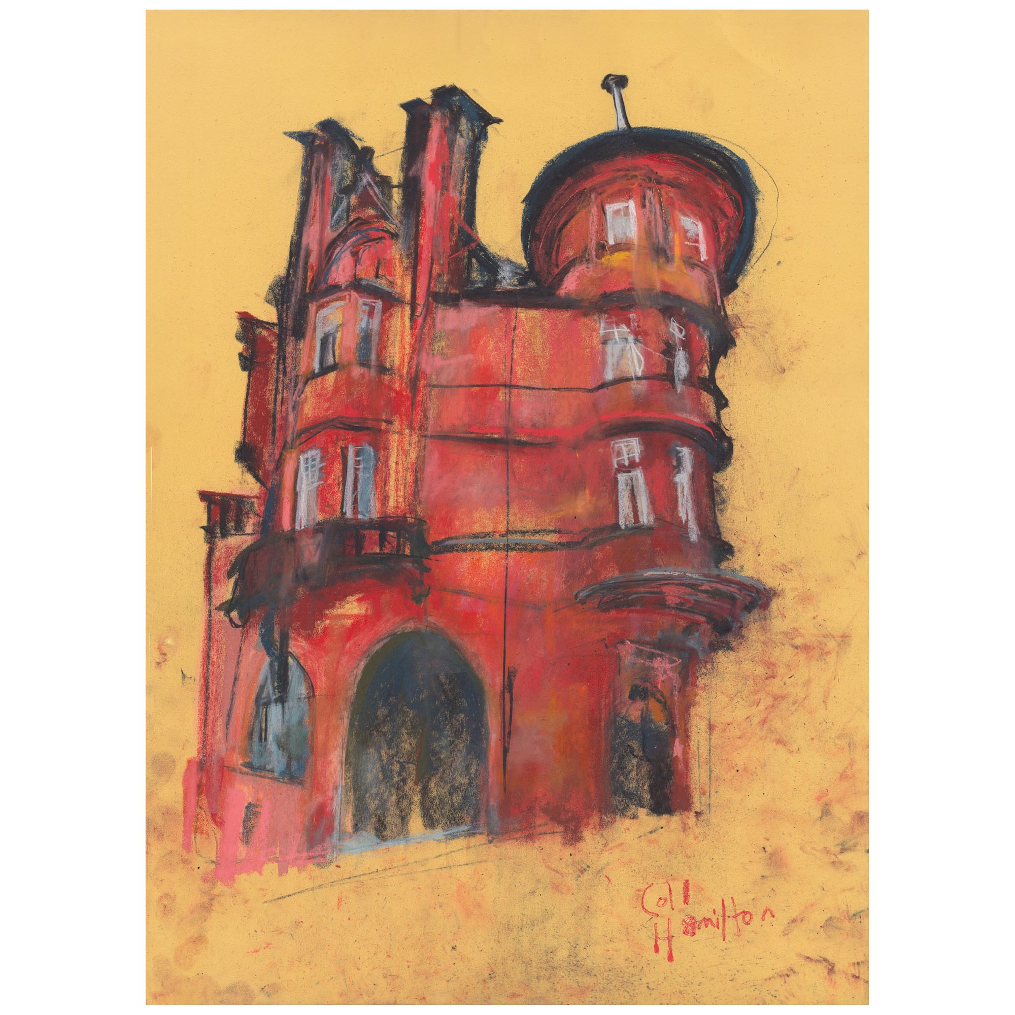 A large drawing of Caledonian Mansions standing on Great Western Road and Caledonian Crescent beside Kelvinbridge over the River Kelvin in the west end of Glasgow.