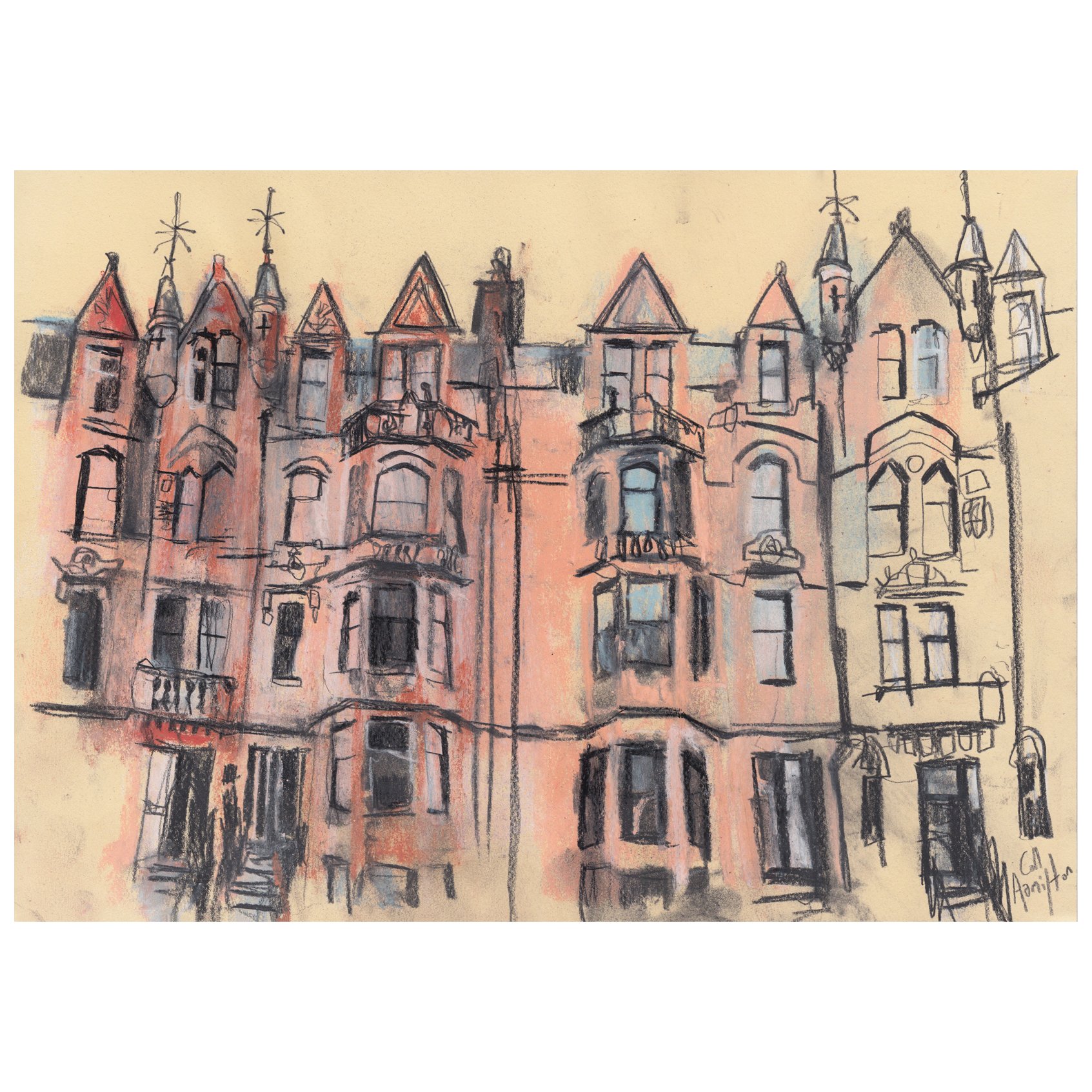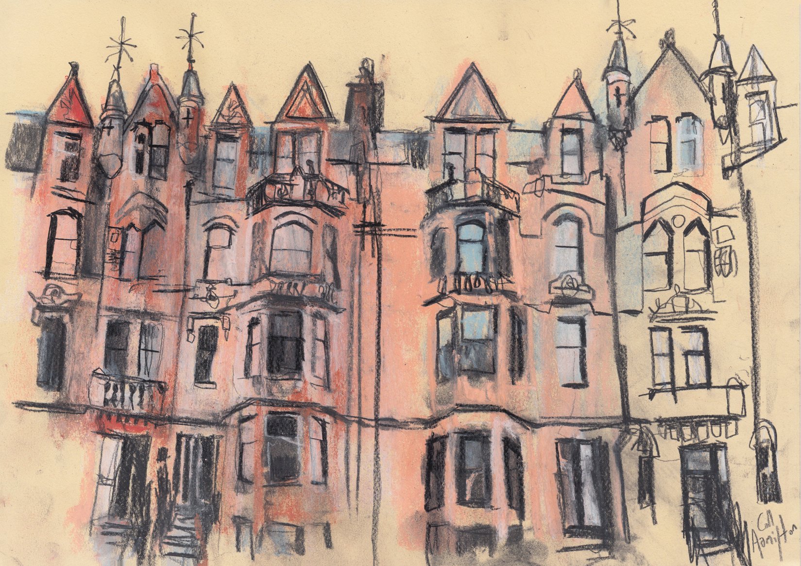 A drawing of tenements standing on Broomhill Drive in the west end of Glasgow.