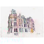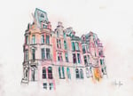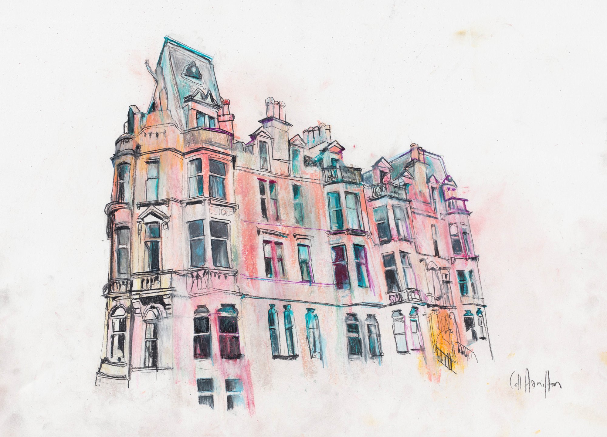 A drawing of tenements standing on the corner of Queens Drive and Langside Road across from Queens Park in the Crosshill area of the Southside of Glasgow.