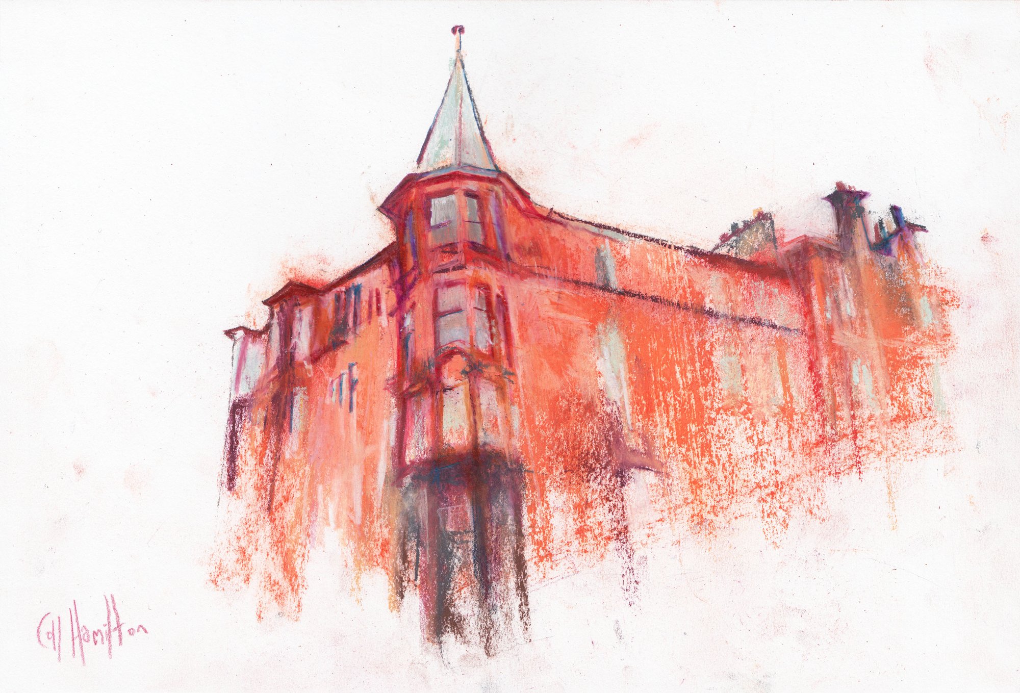 A drawing of tenements standing on the corner of Clarence Drive and Polwarth Street in the Hyndland area of the west end of Glasgow.