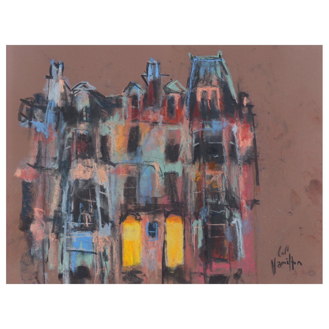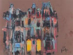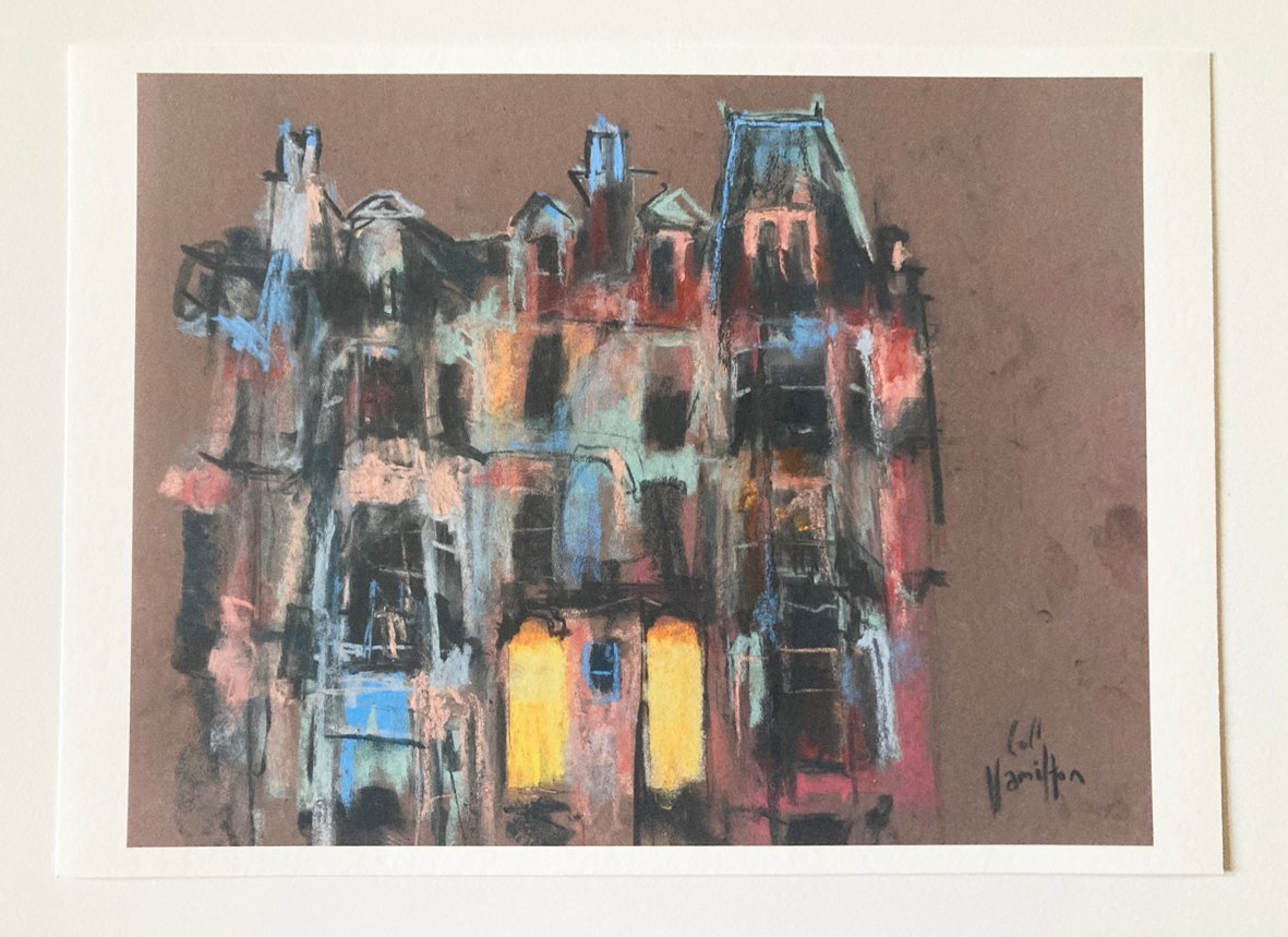 The drawing is of a tenement with yellow doors which stands on Langside Road near Queens Park in Crosshill on the Southside of Glasgow.