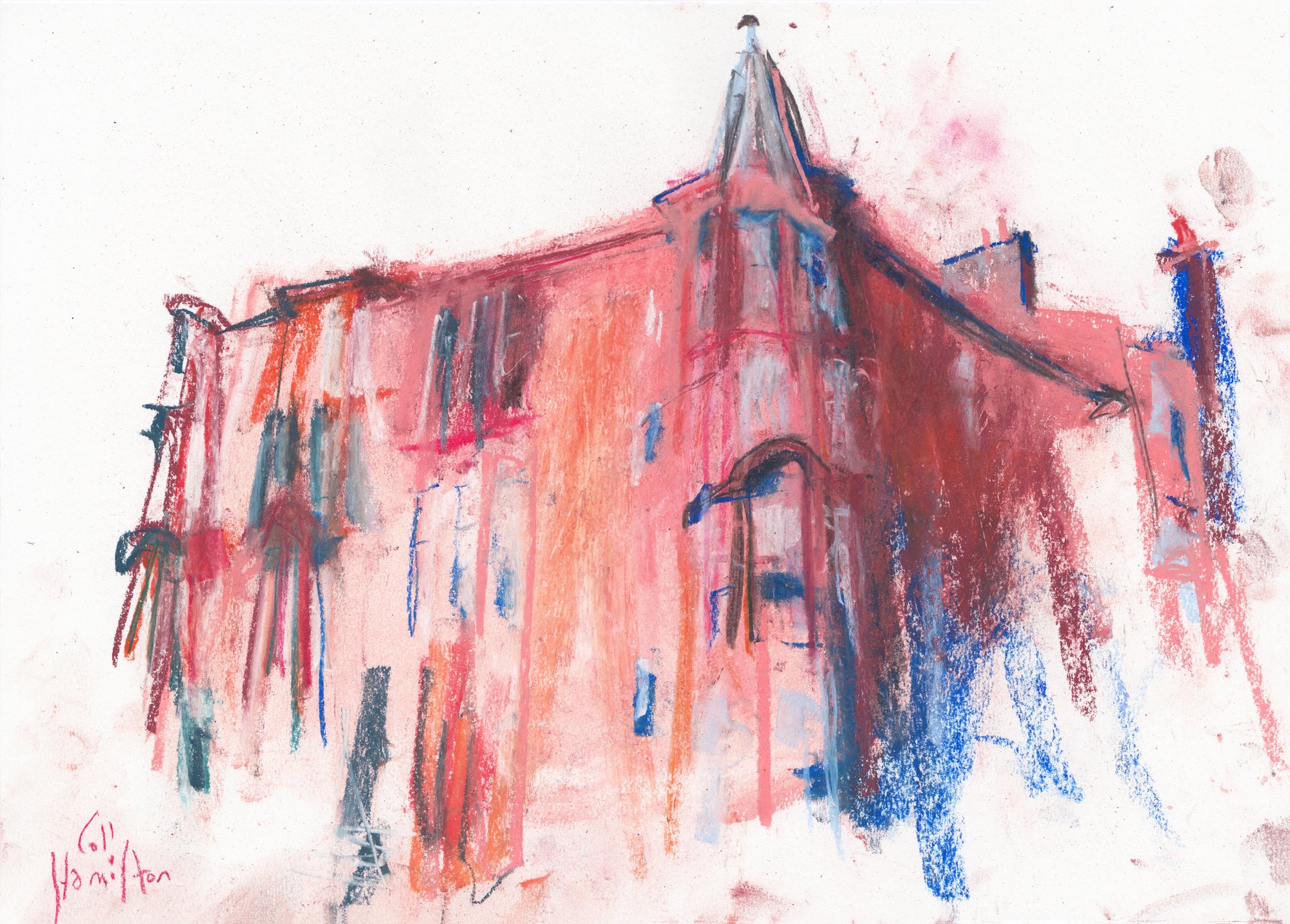 A drawing of tenements standing on the corner of Clarence Drive and Falkland Street in Hyndland in the west end of Glasgow